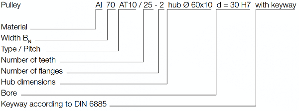 The material and the dimensions of the synchronising pulleys, e.g. number of teeth, pulley width, bore holes and arrangement of flanges are stated by the customer. In the following please find information for the planner and designer.