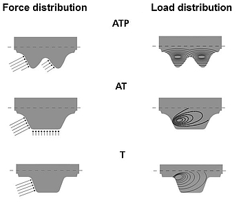 The high specific tooth strength of the ATP profile, for example, is achieved by the optimised force and load distribution. The affective force is distributed to two tooth faces.