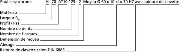Le matériau et les dimensions des poulies synchrones comme le nombre de dents, la largeur de la poulie, l´alésage et la position des flasques sont définies à la commande. Vous trouverez ci-après des recommandations pour passer vos commandes.