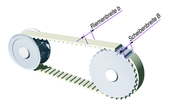Der Riemenbreite b wird jeweils eine Zahnscheibenbreite B zugeordnet, die ausreichendes seitliches Spiel garantiert. Die "lichte Breite" wird nicht gesondert bemaßt.