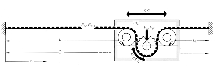 Die erforderliche Umfangskraft FU in der Antriebsstation ist nach Gleichung (4) zu ermitteln. Mit der vorläufigen Annahme der Zahnscheibengröße kann für die Antriebsstation das zugehörige Antriebs-Drehmoment M nach Gleichung (2) berechnet werden. Es hängt von der Art und Wahl des Antriebsmotors ab, inwieweit das berechnete Drehmoment M mit dem Drehmomentverlauf des Motors in Einklang gebracht werden kann. Die Wahl des Motors hängt auch von den gewünschten Stell- und Positionieraufgaben ab. Nach der Festlegung des Antriebsmotors ist als Berechnungsgrundlage zur weiteren Genauauslegung des Zahnriemens der tatsächliche Drehmomentverlauf des Motors heranzuziehen.