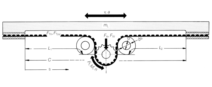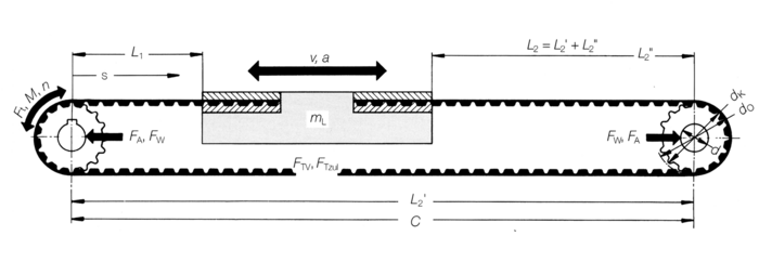 In der Regel sind die Masse des Linearschlittens mL und die Beschleunigung a die bestimmenden Größen für die Antriebsauslegung von Lineartrieben. Auf der Seite Bestimmung von Riementyp und Riemenbreite kann nach dem Auswahl-Diagramm Riementyp und Zahnriemenbreite aus Masse und Beschleunigung ermittelt werden.